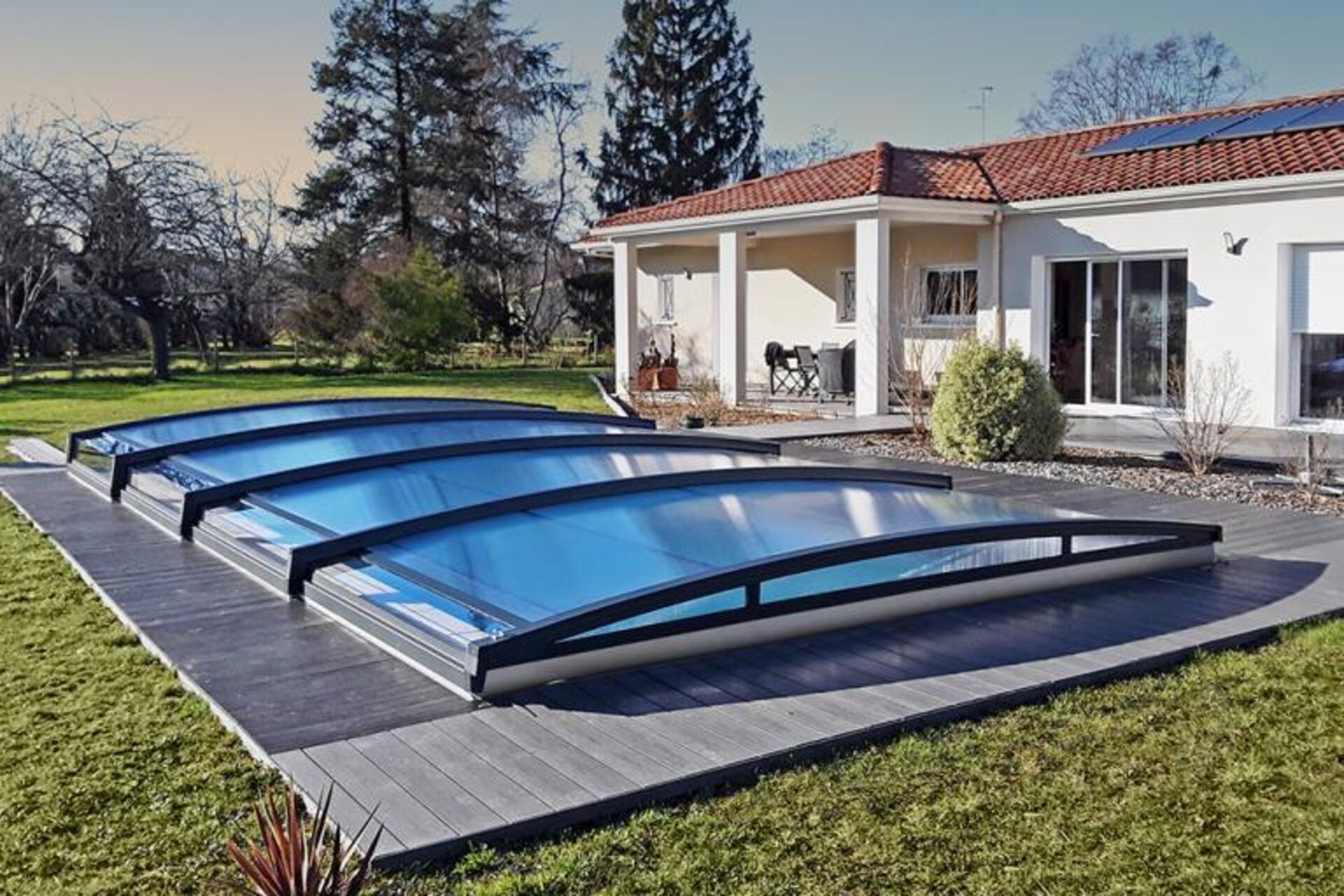 L’abri bas prolonge considérablement la saison de baignade en conservant la chaleur, tout en sécurisant efficacement votre bassin contre les intrusions et en réduisant les besoins d'entretien en limitant l’entrée des débris.